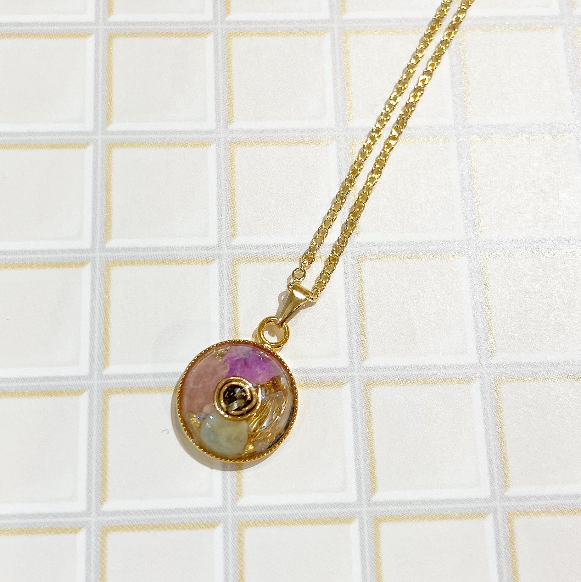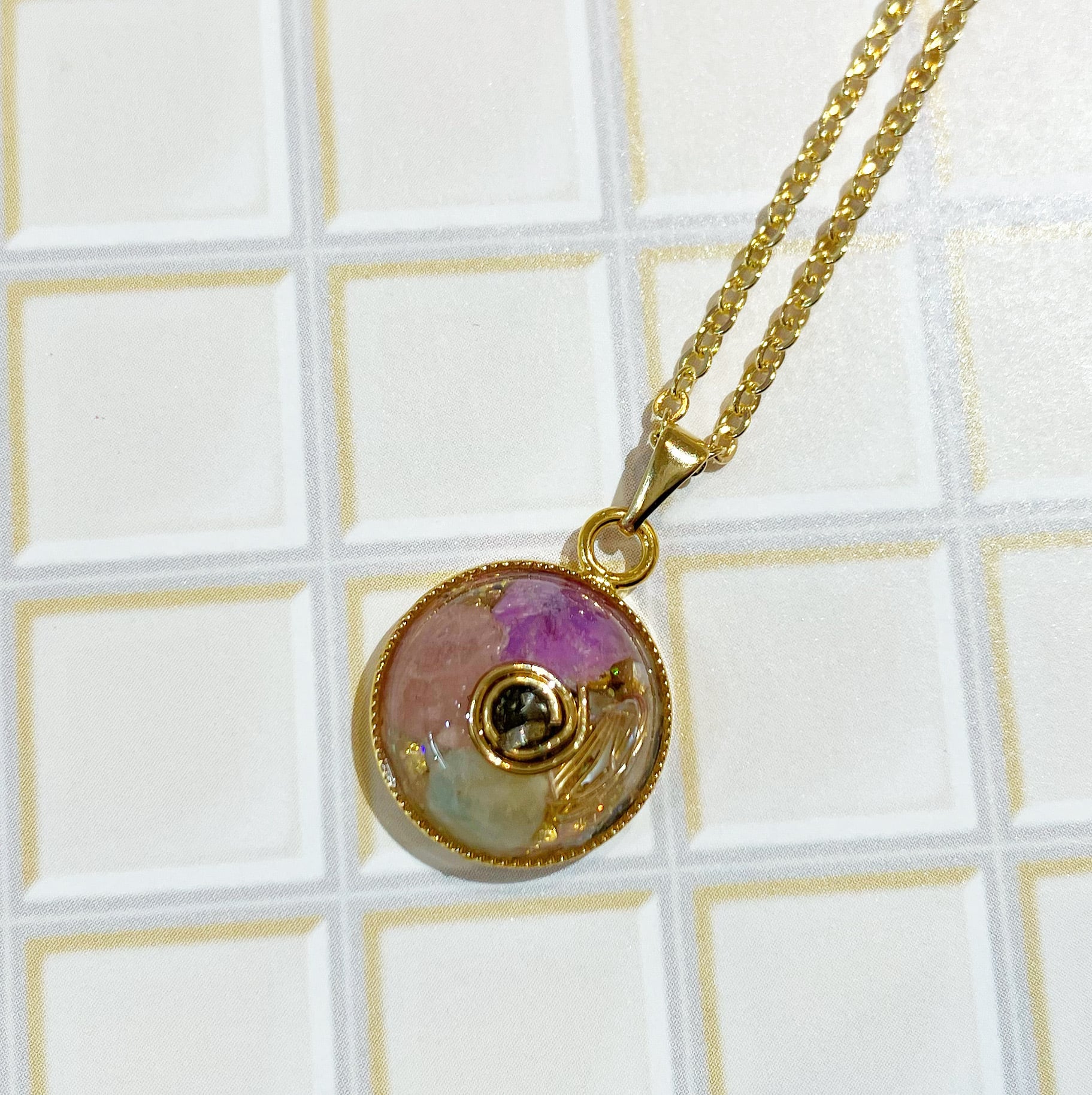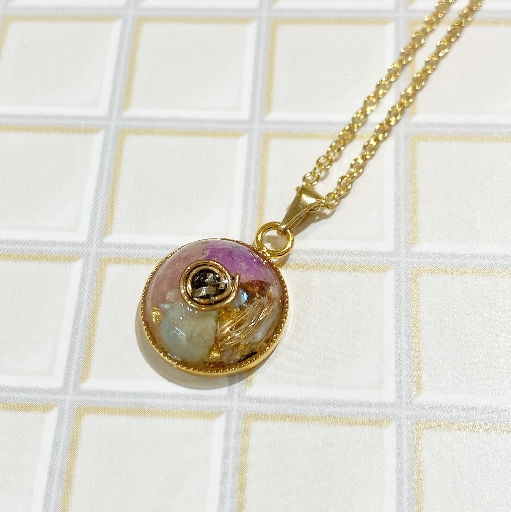 使用素材:超隕石®︎、天然石、金属、ラメ、ペンダントトップ台座・チェーン(真鍮)