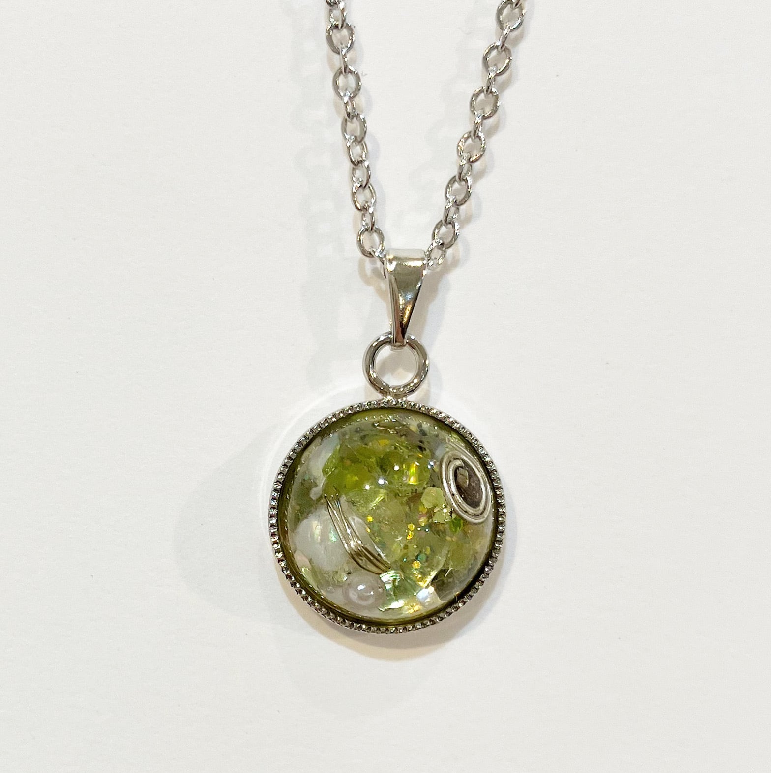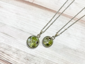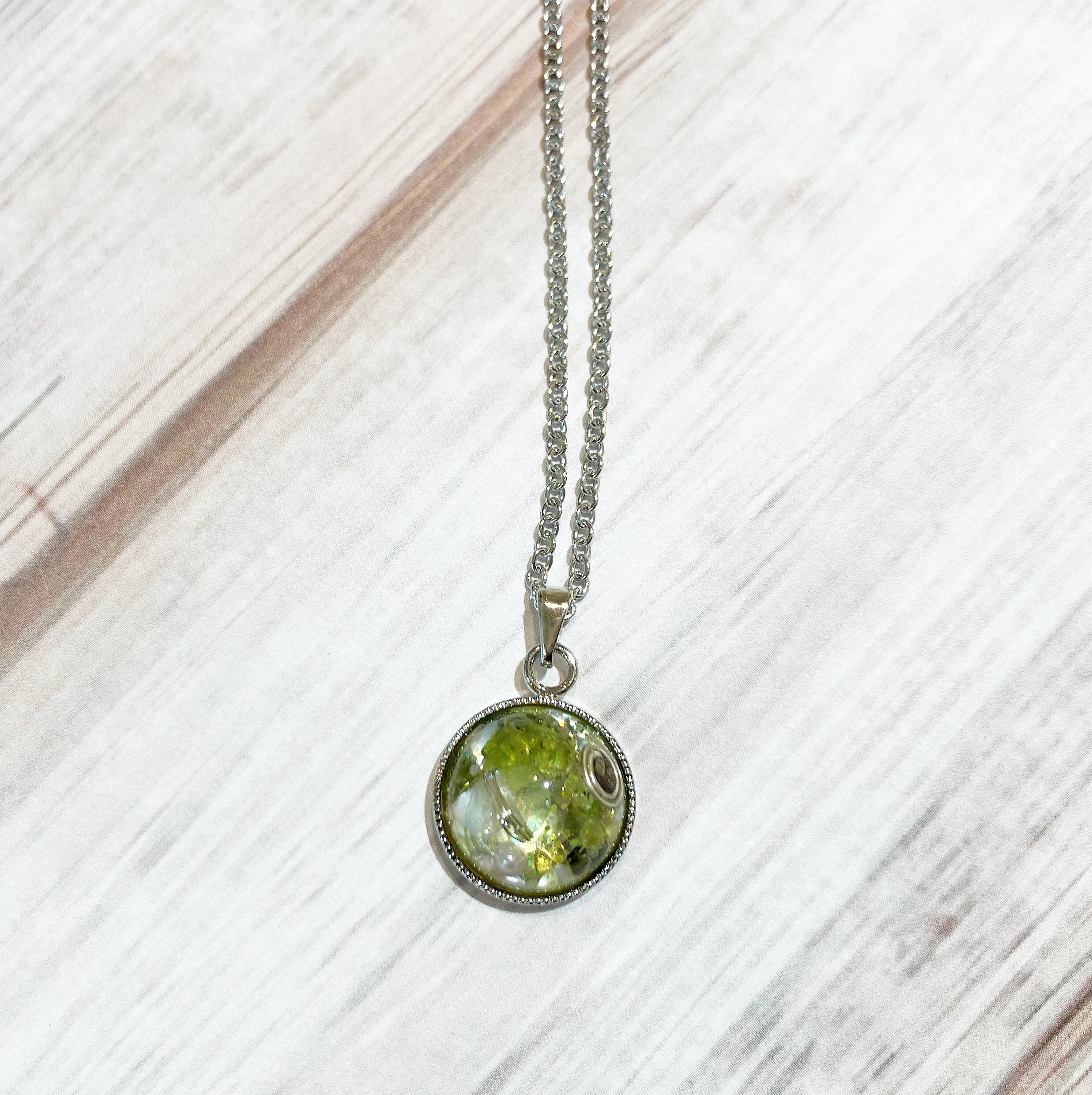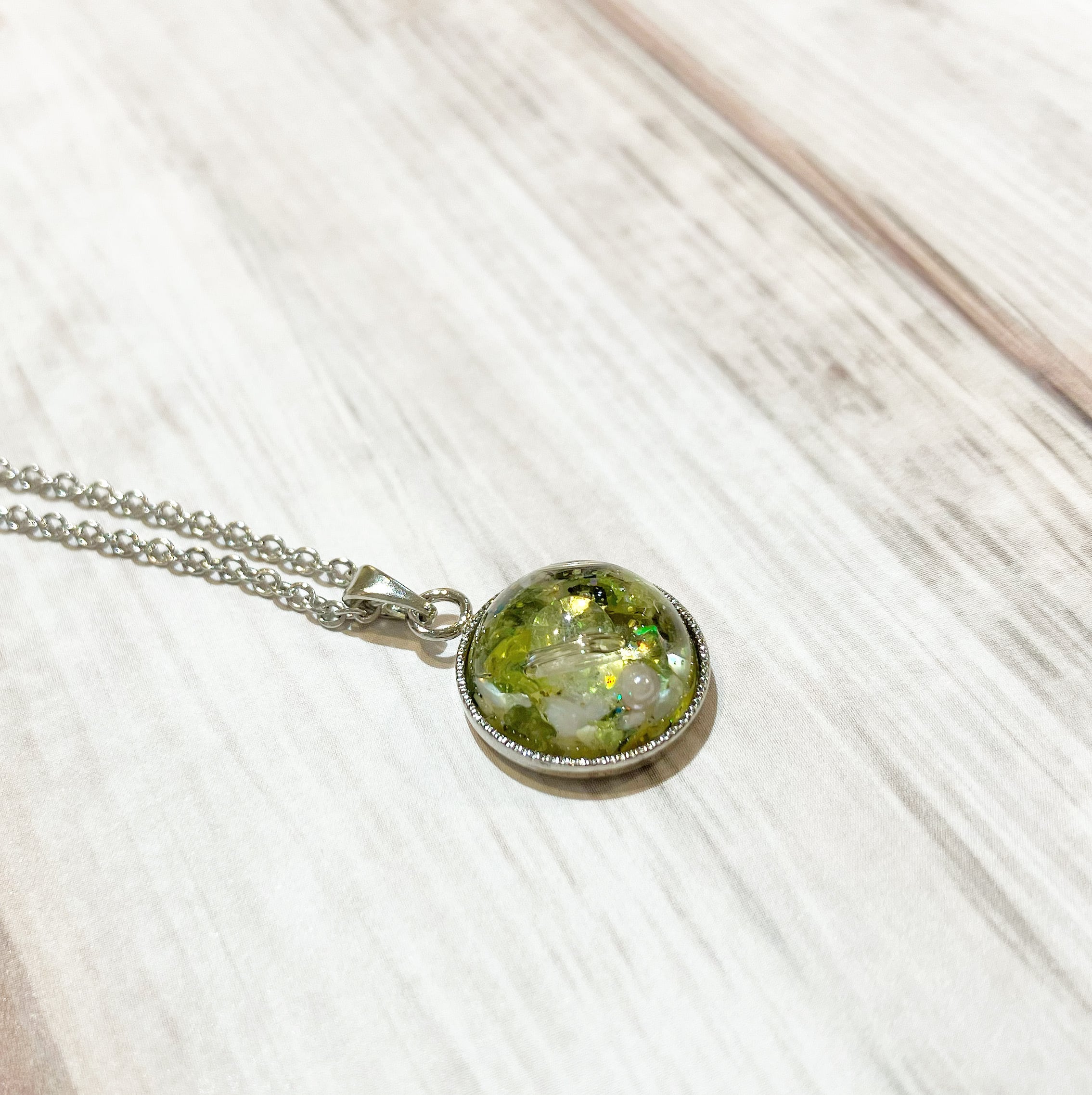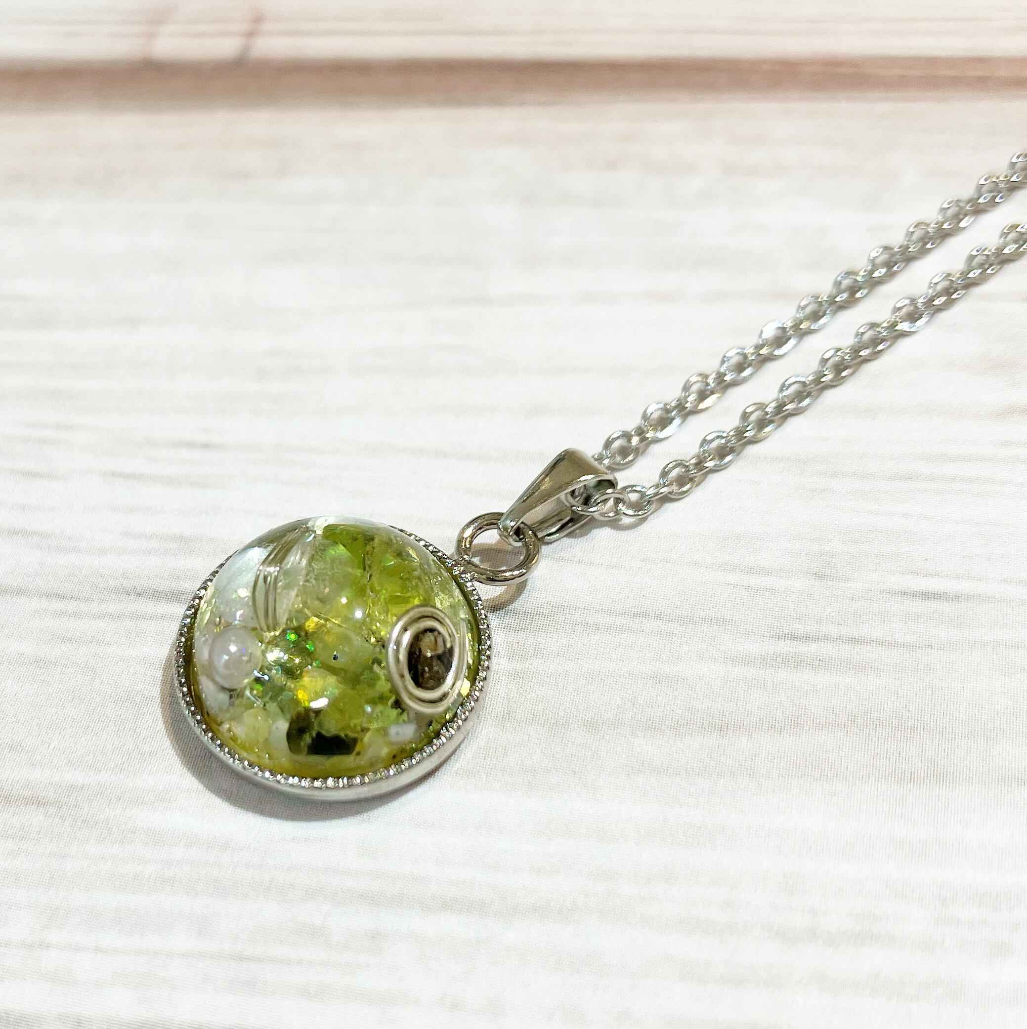 【8月の誕生石「ペリドット」2種と水晶、超隕石®︎の入ったオルゴナイトネックレスです】