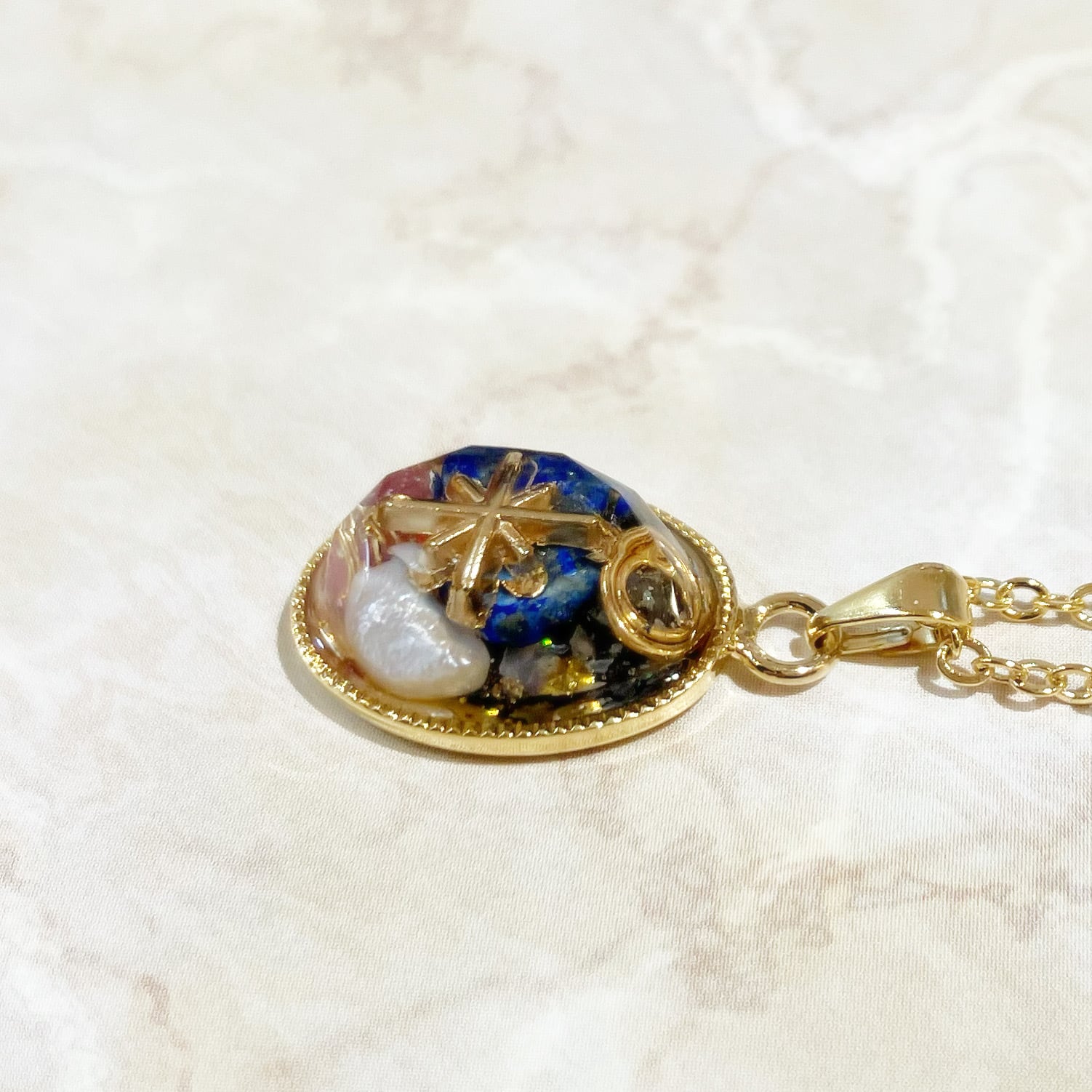 使用素材:超隕石®︎、天然石、金属、ラメ、ペンダントトップ台座・チェーン(真鍮)