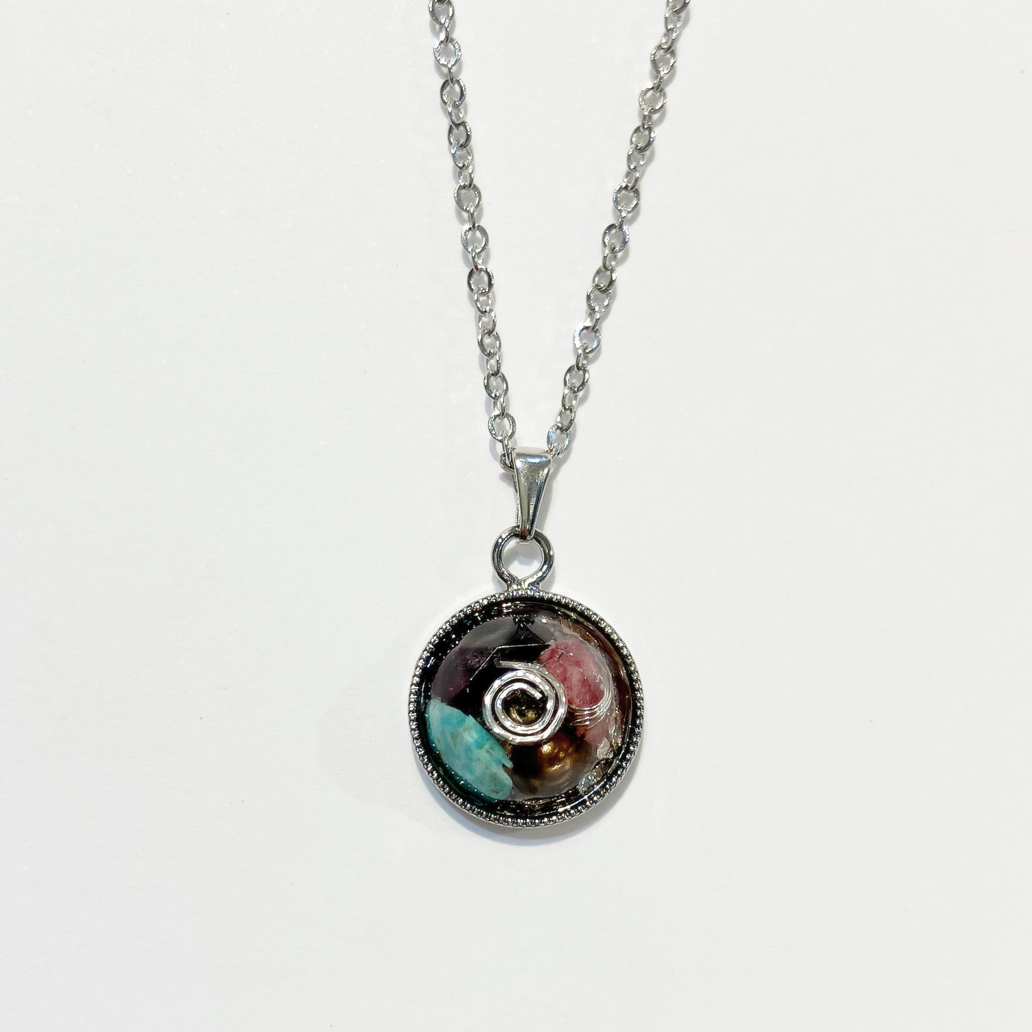 この隕石入りオルゴナイトネックレスは、ターコイズ、ガーネット、ピンクトルマリン、そして超隕石®︎で作られています。