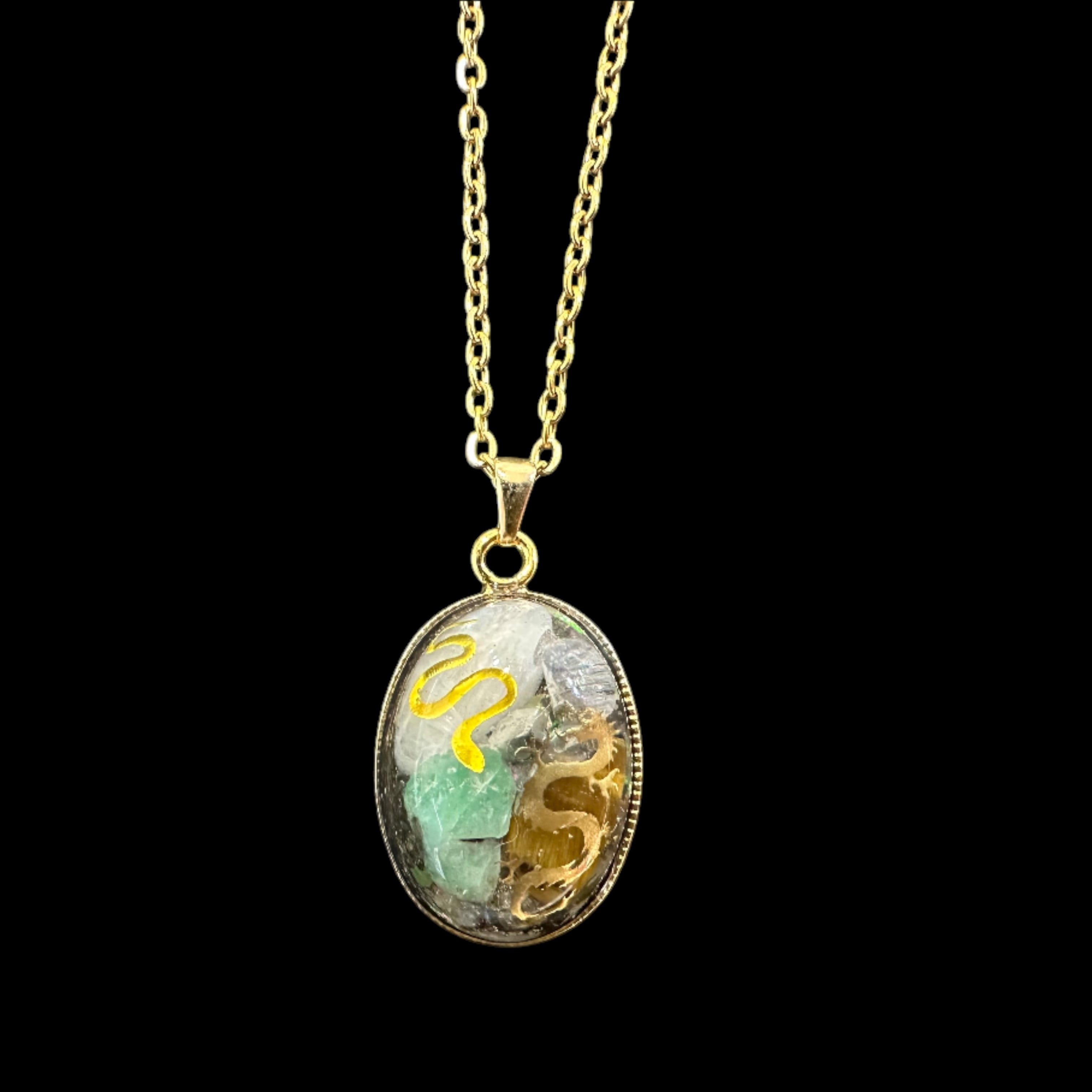 【天恵】天地を動かす龍と蛇☆超隕石×天然石一粒ジュエルネックレス【ゴールド】【7406】