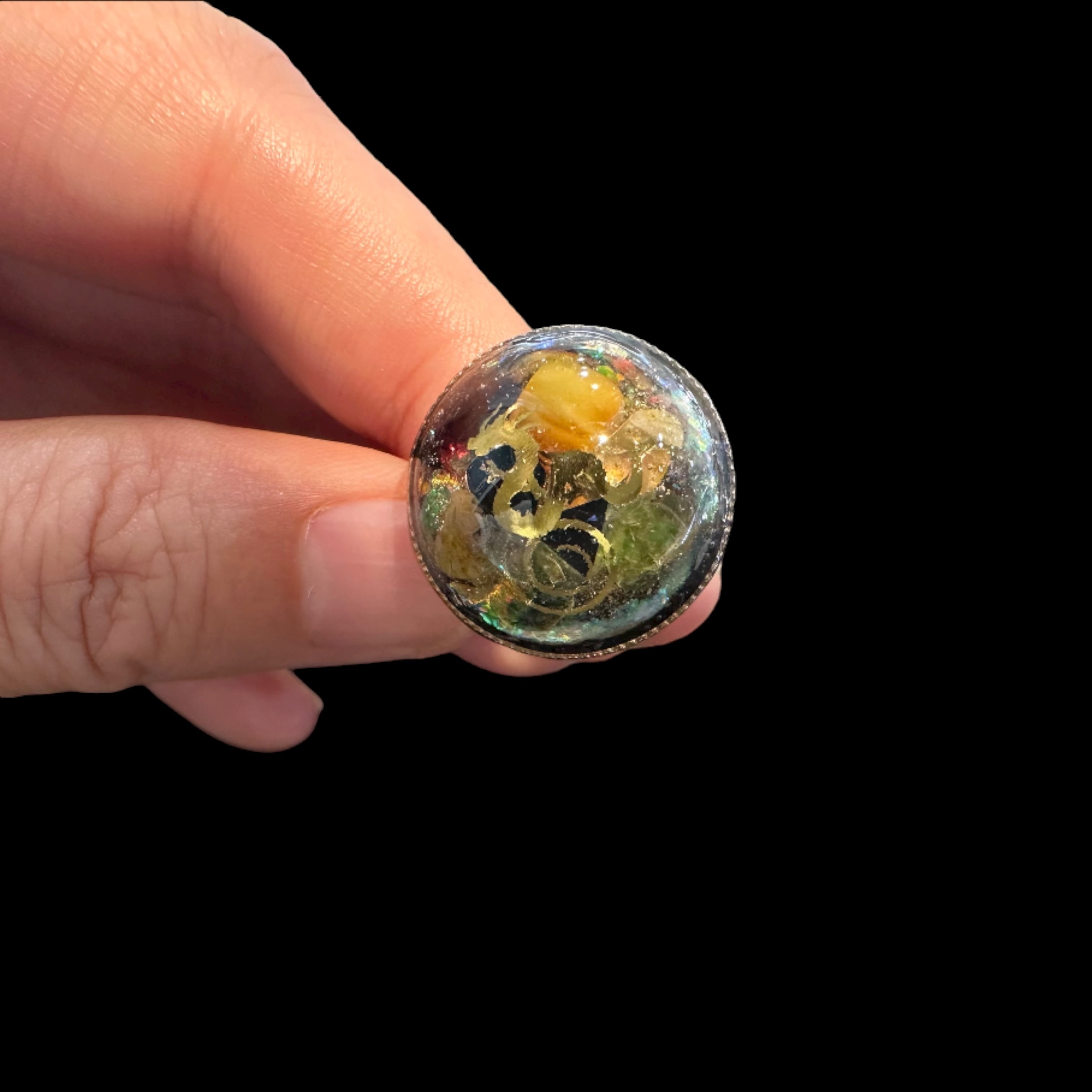 超隕石の粉(イミラックパラサイト隕石・ギベオン隕石)・アンバー・ルチルクオーツ・ペリドット・ガーネット・マグネタイト・ブラックスピネル・樹脂