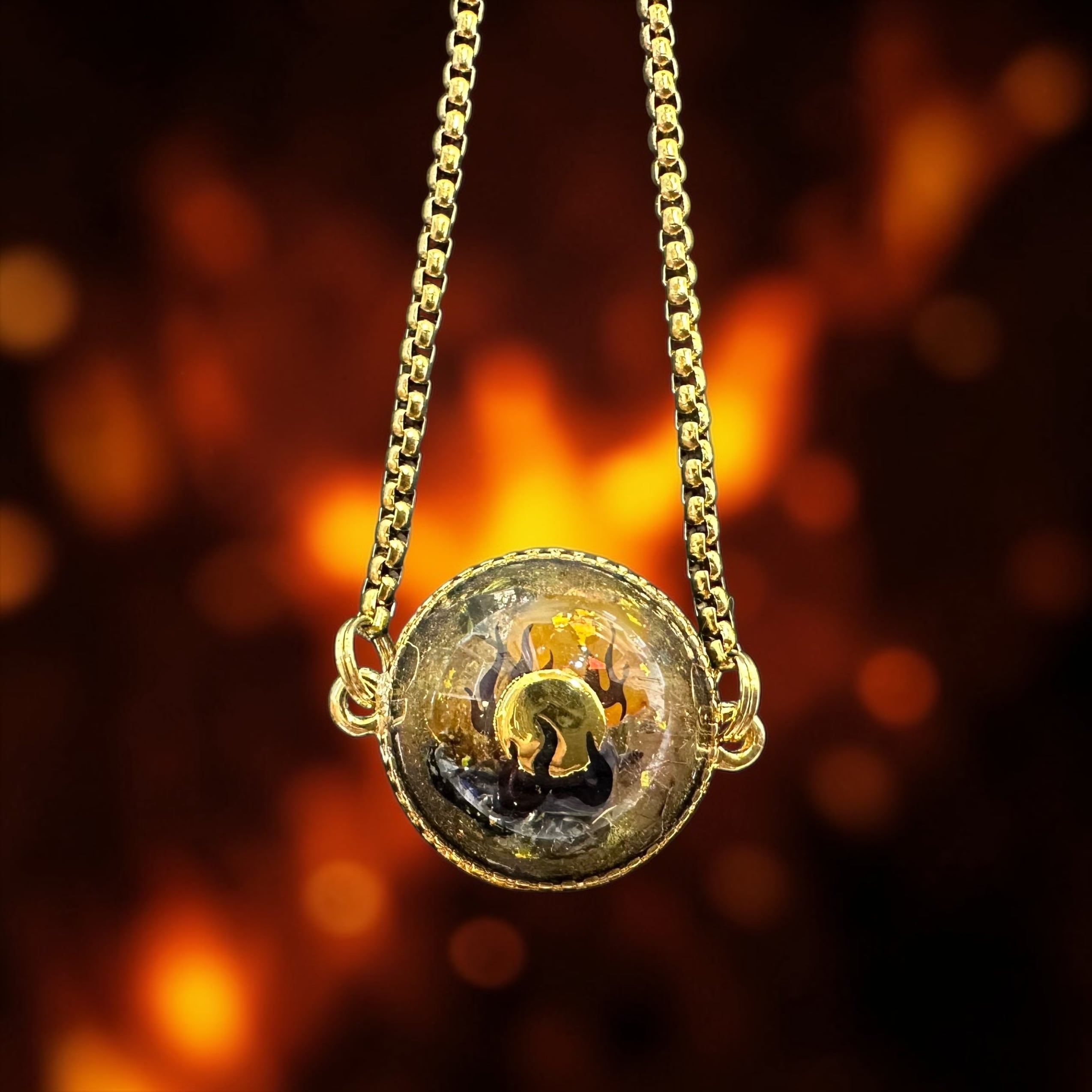 こちらの作品は2025年5月に東京都にある穴森稲荷神社の本殿にて受け取ったエネルギーで制作しました。メラメラと金色の宝玉が燃えている。そのようなイメージでした。