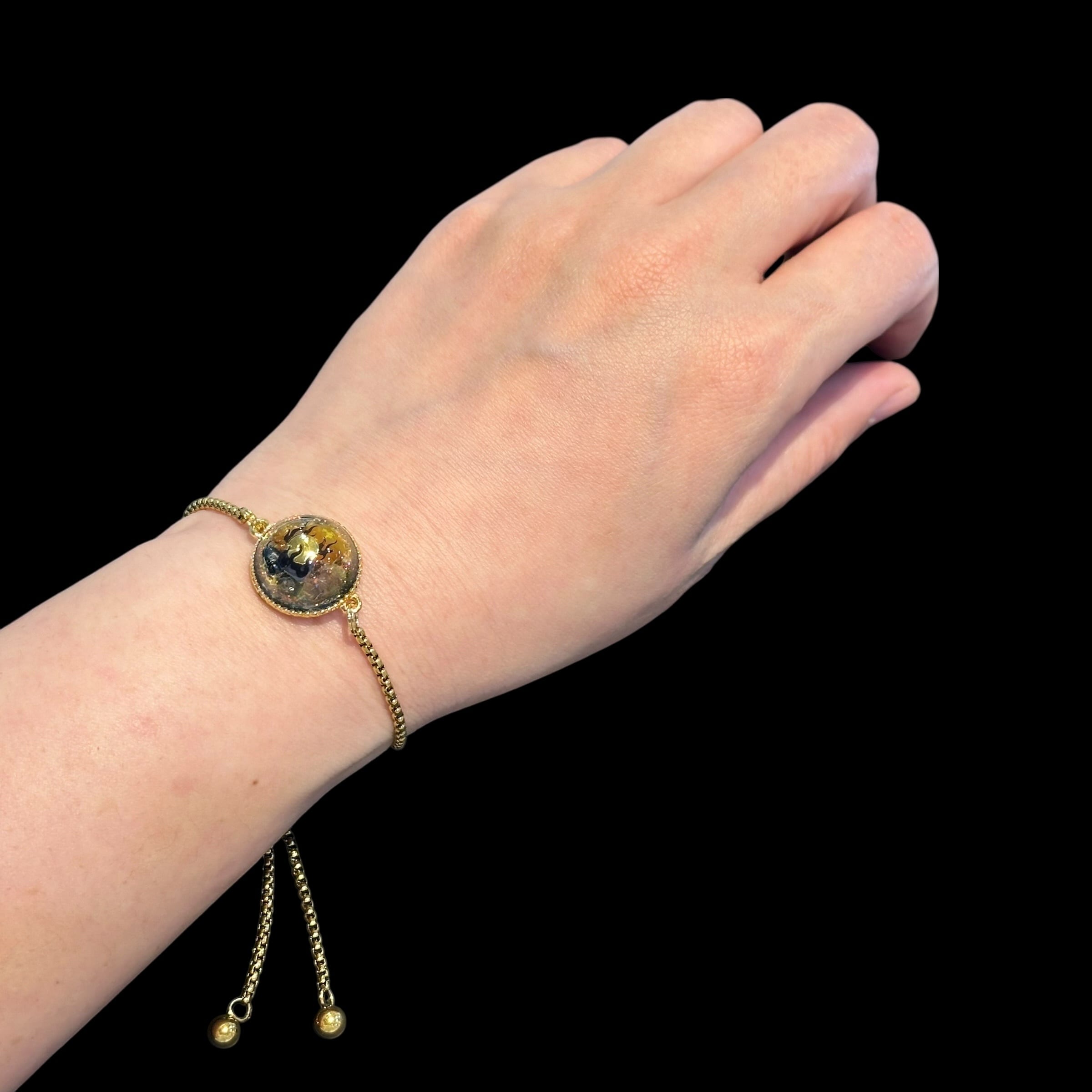ブレスレットはストッパーで長さが自由に調整できるのが魅力の一つ。手首のサイズに合わせて調整してお使いいただけます。