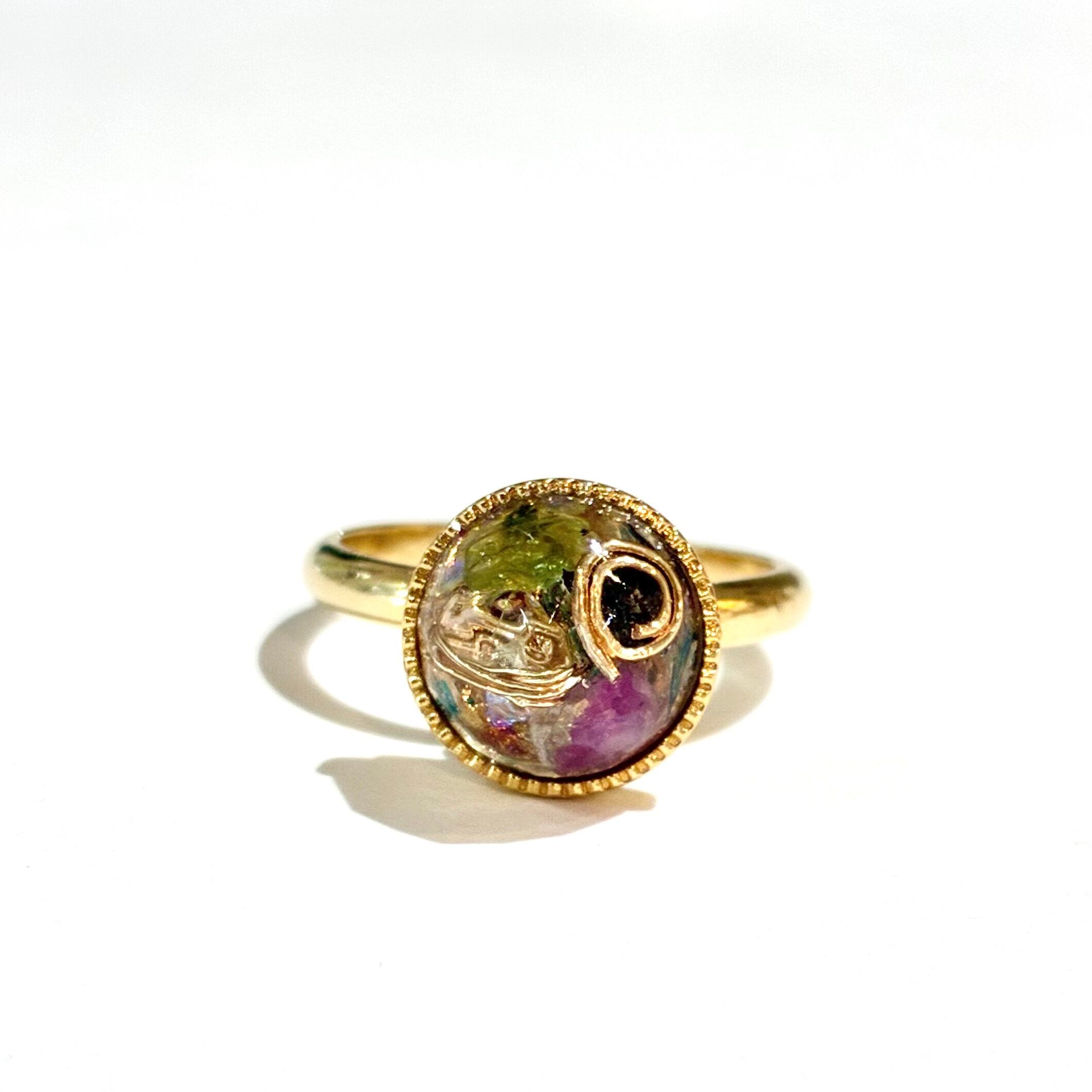 「宇宙の泉」と名付けたこちらの隕石入りオルゴナイトリングは、限りなく湧き出る豊かさを制限なく受け取っていただけるようお作りしたものです。