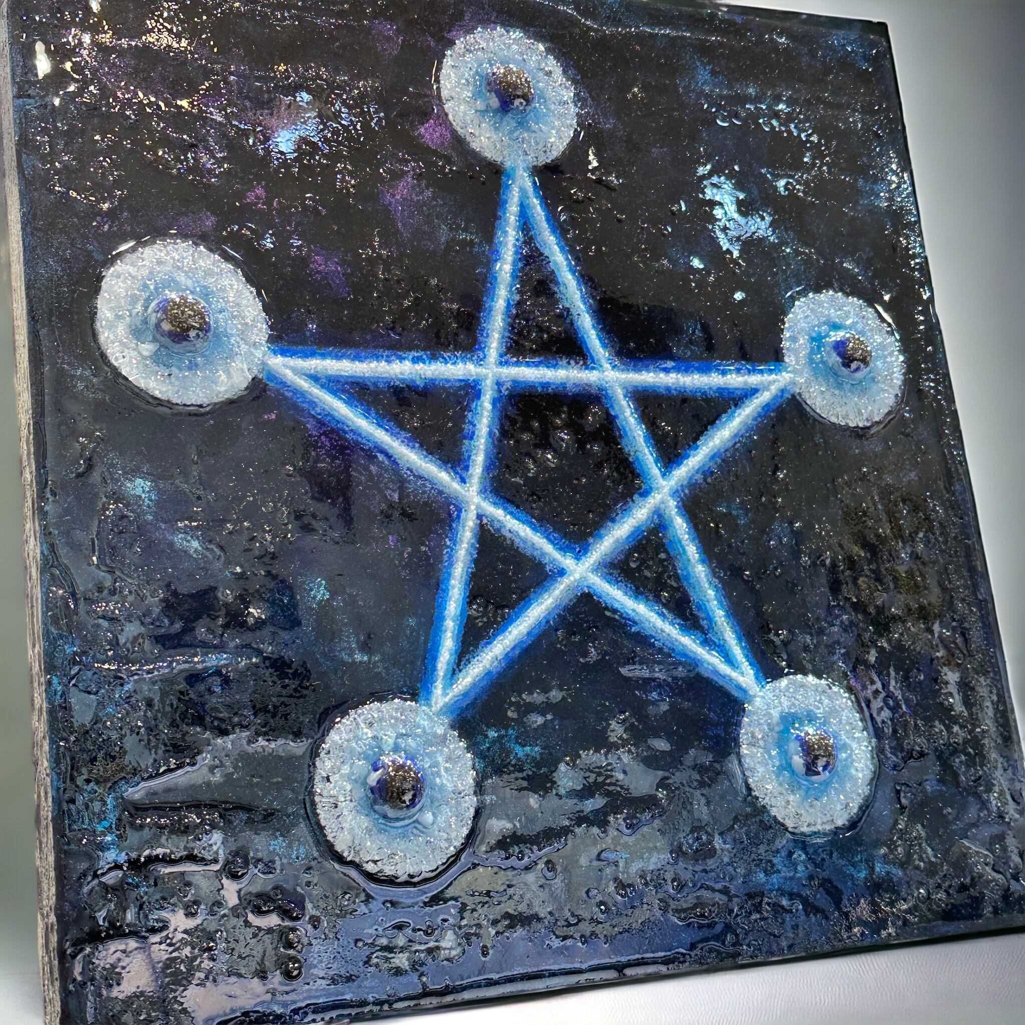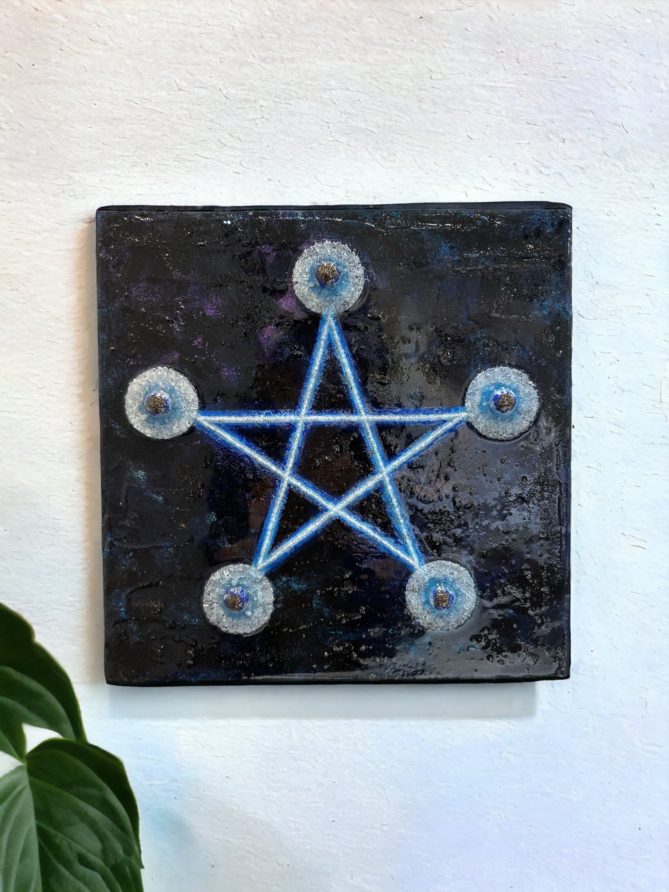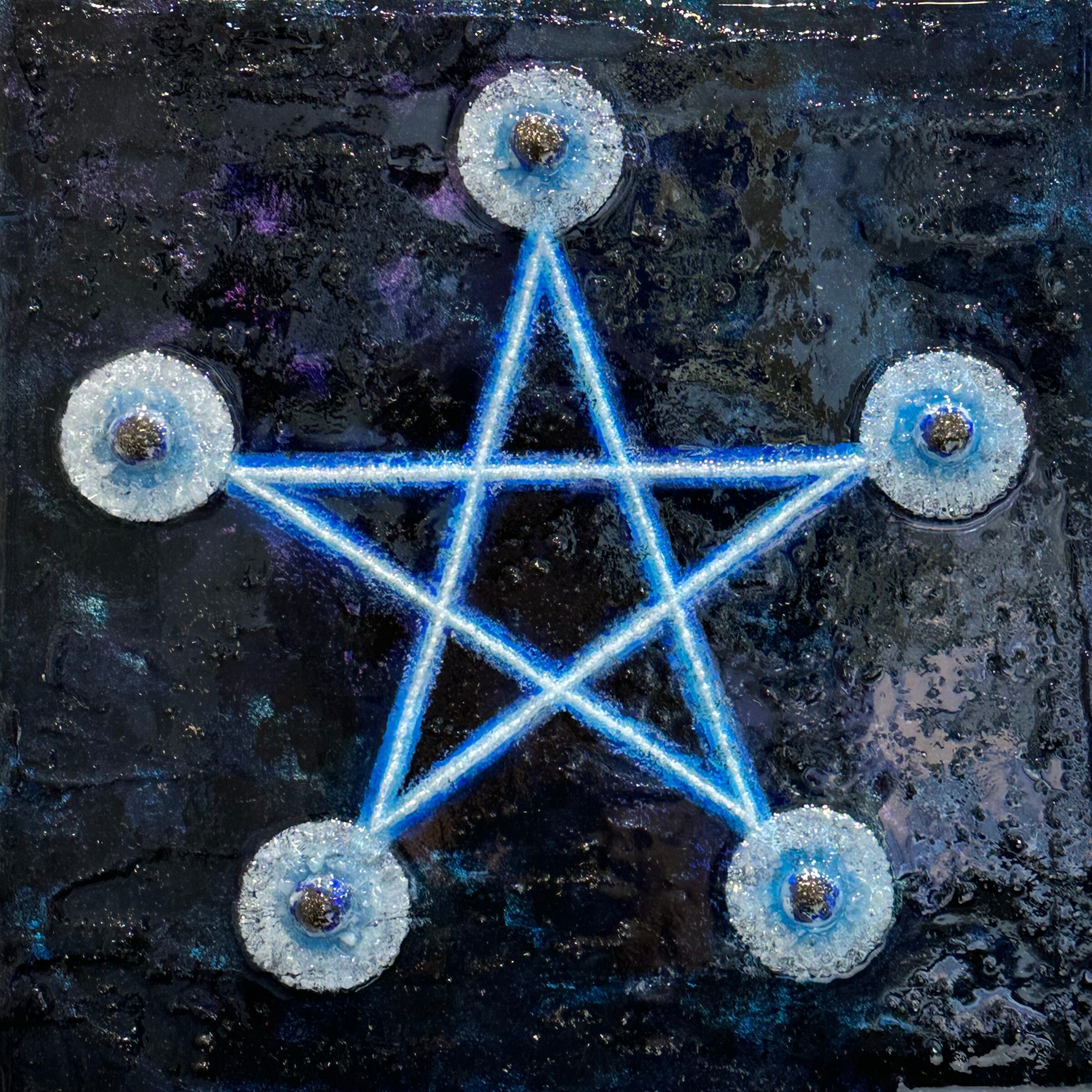 こちらの作品は東京都の深川不動堂にお参りに行った時に2階のお不動様に「何か私に作って欲しい作品がありましたら、お伝えください。」とお願いしたところ、五つの光とそれを繋ぐ五芒星の姿のイメージがパッと降りて来ました。