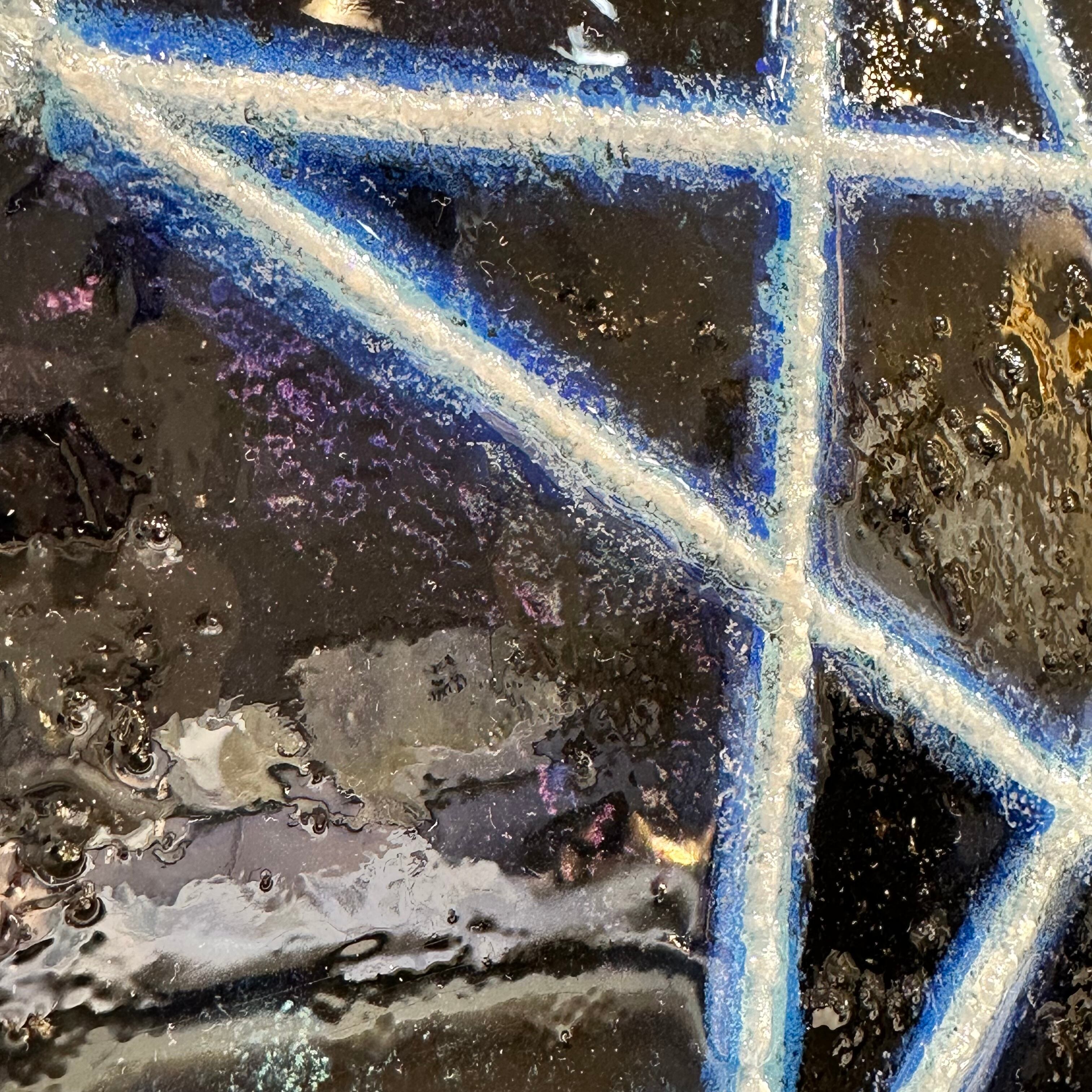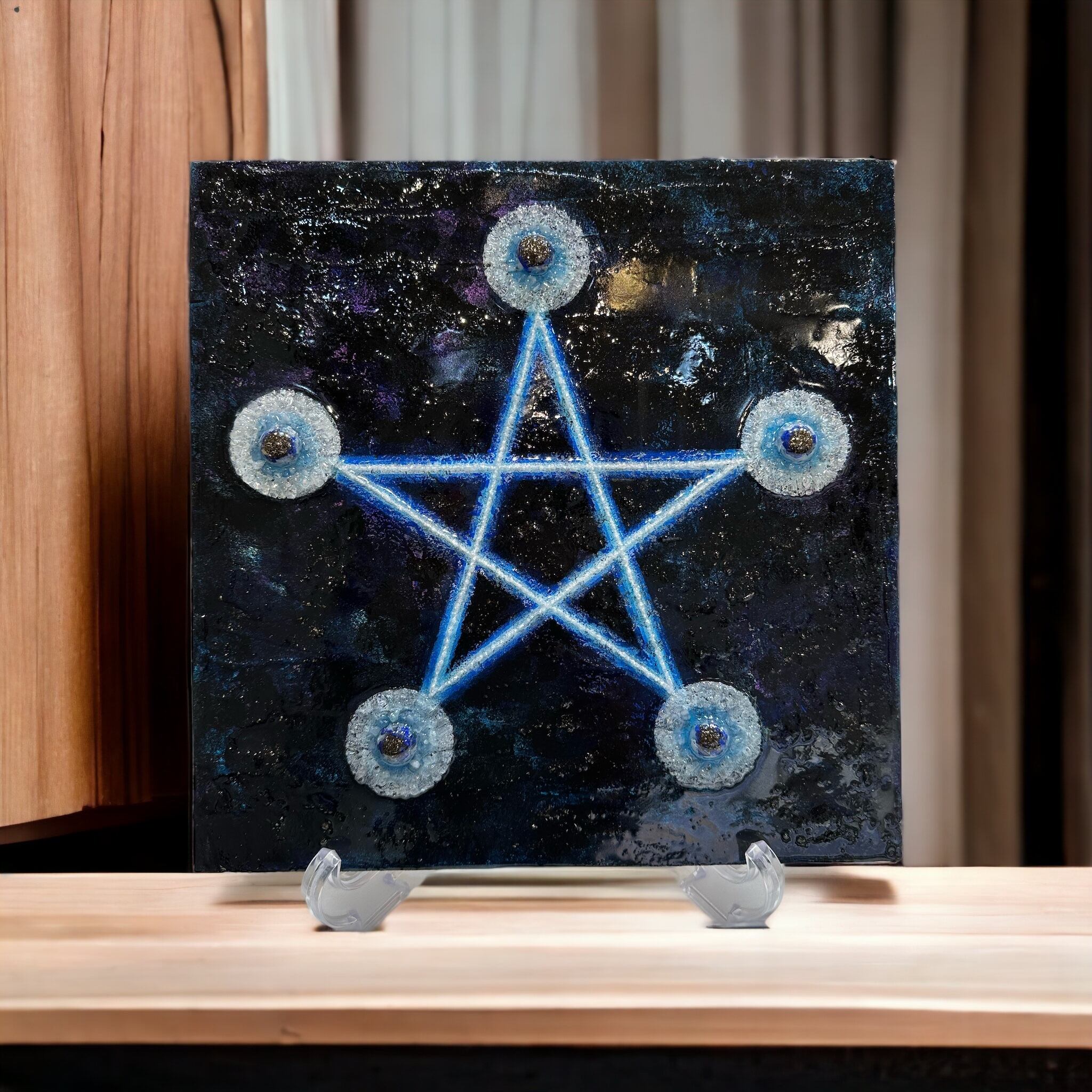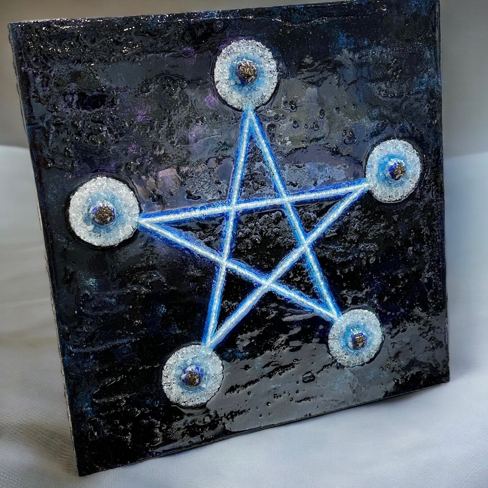 こちらの作品は東京都の深川不動堂にお参りに行った時に2階のお不動様に「何か私に作って欲しい作品がありましたら、お伝えください。」とお願いしたところ、五つの光とそれを繋ぐ五芒星の姿のイメージがパッと降りて来ました。
