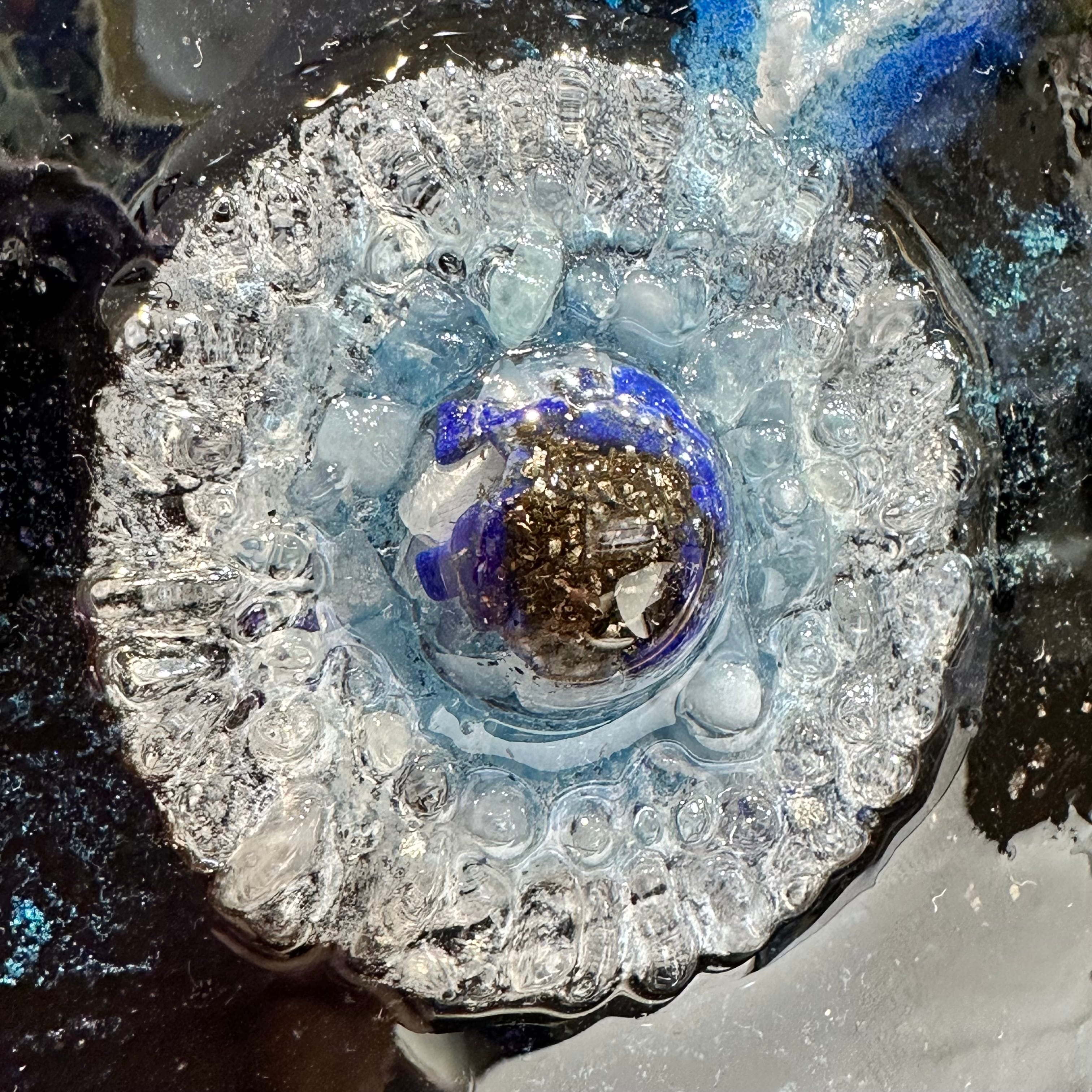 5つの光の中心には隕石の粉そこに青いラピスラズリ、アクアマリン、水晶が放射状に広がっています。