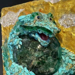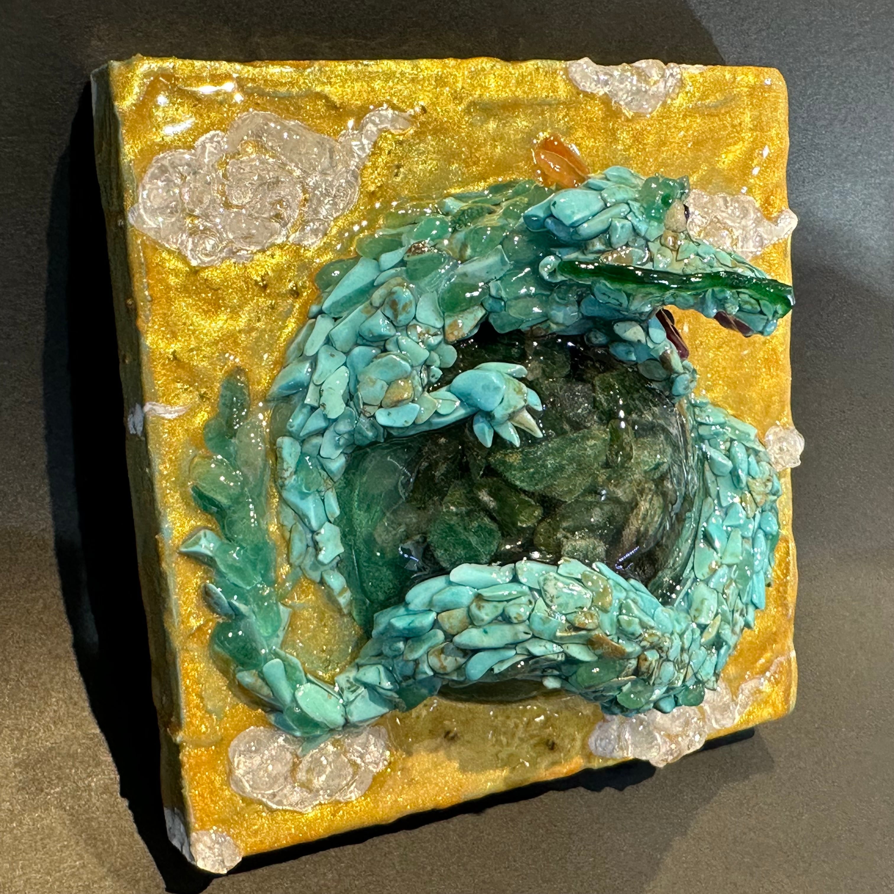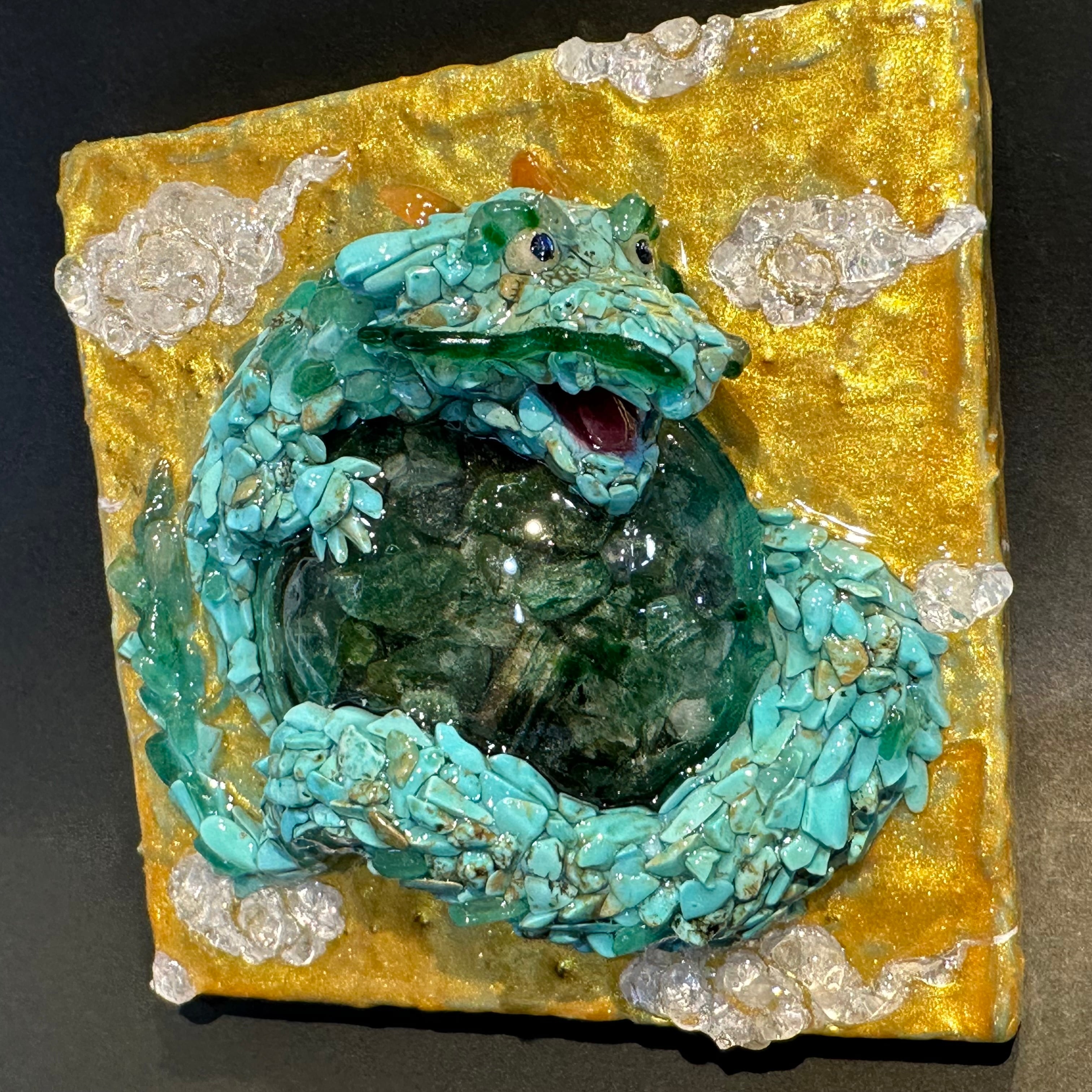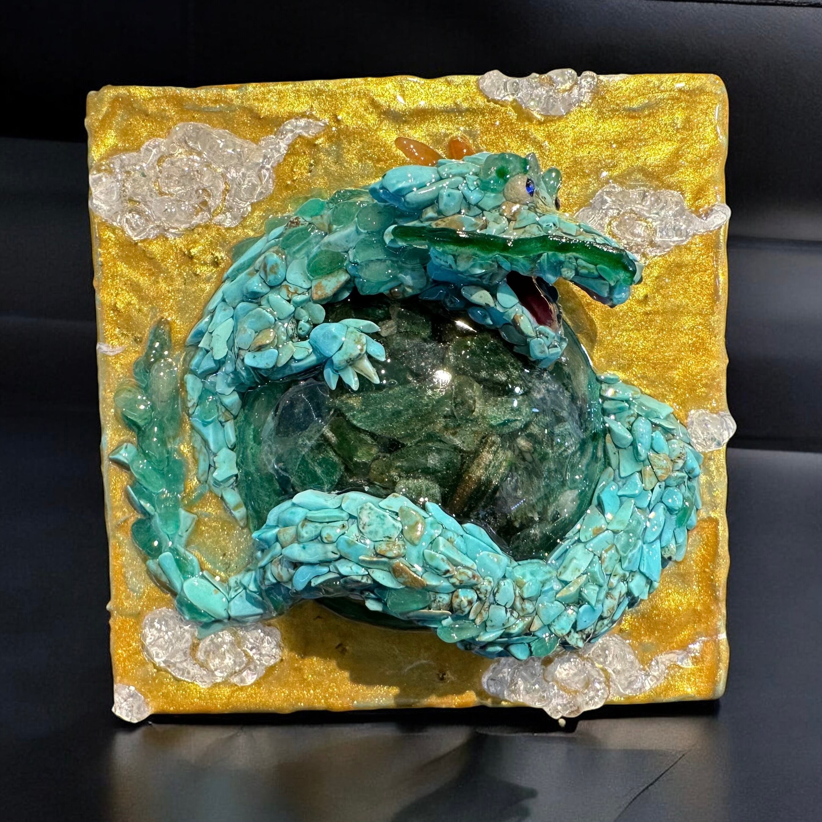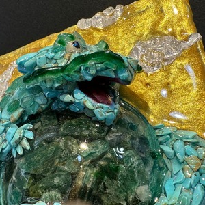 こちらの龍は手に持っているアベンチュリンの宝珠を見ていた時にすっとイメージに浮かび、どの石を使ったらいいんだろう?と思っていたところ、呼ばれるように惹かれるお店で見つけた新しい石を購入して、制作した龍になります。